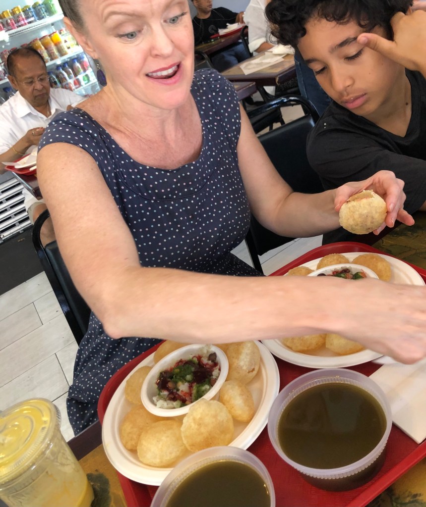 Despite stuffing ourselves while in Jackson Heights, we also made Bhelpuri when we got back to the diner. Bhelpuri is a street food famously served at the beaches in Mumbai. The base is a mix of crunchy fried snacks made from rice, chickpea flour, and peanuts) and bits of broken puri (fried bread) topped with fruit and green chutney’s and fresh mango, tomato, onion, cilantro. It is SO weird and so, so, so good. The kids were not so into the pani puri (which also falls into the bizarre Indian street food category) but they were all in on the Bhelpuri. Here is a recipe for bhelpuri (minus the puri because I avoid gluten).