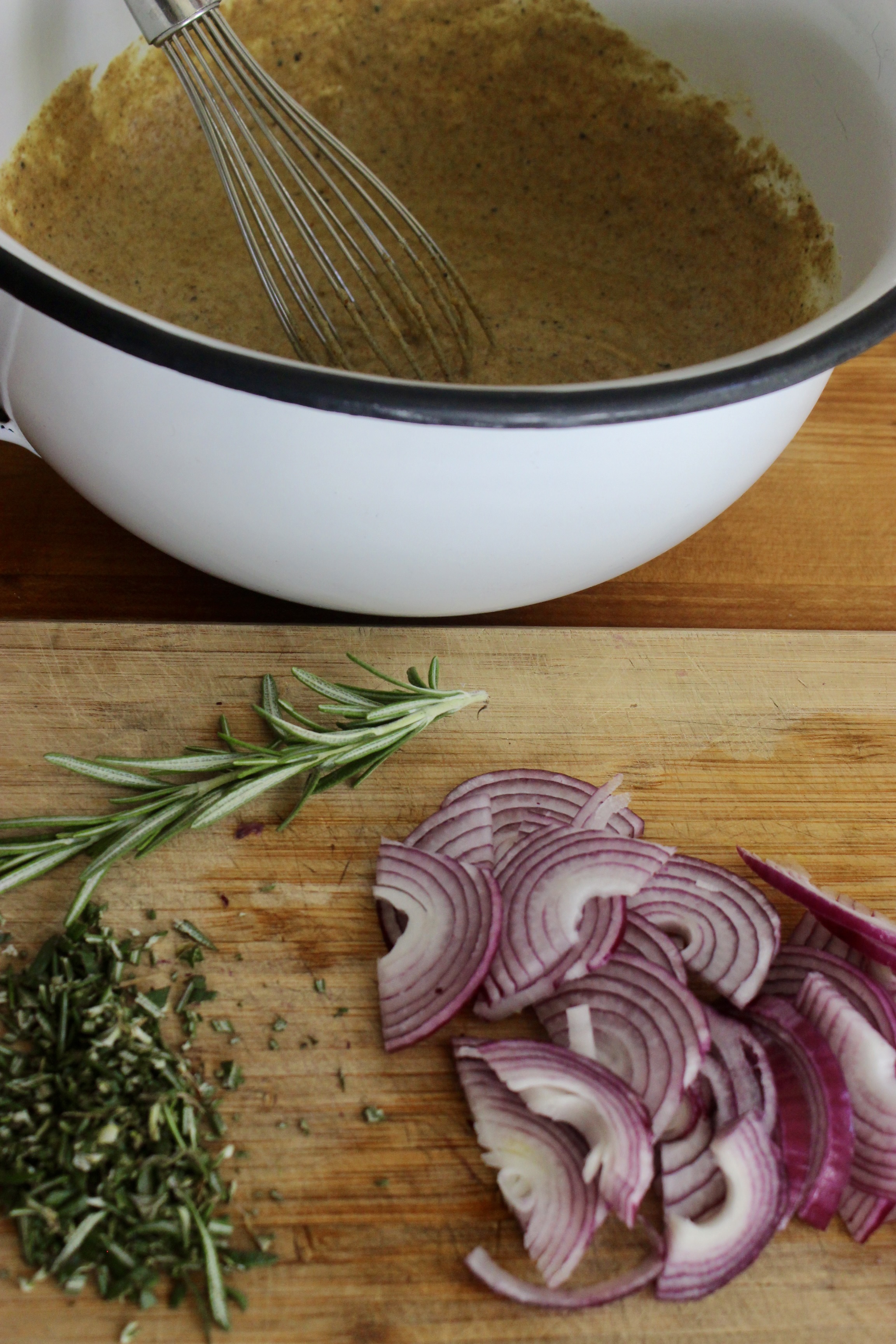 - Thinly slice the red onion and mince 1 Tablespoon of rosemary. Stir the rosemary into the batter then pour the batter into the greased pan. Top with the onions.