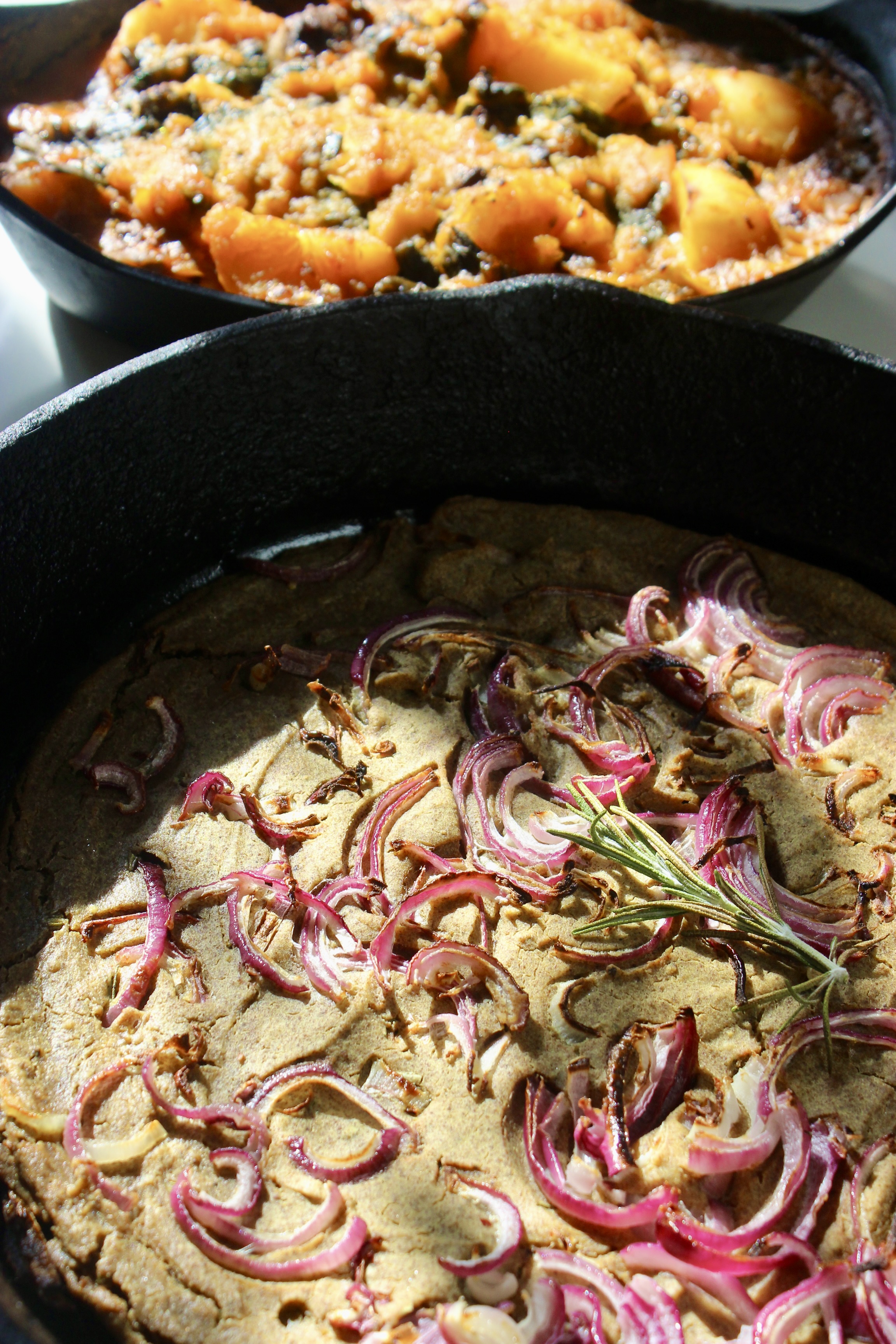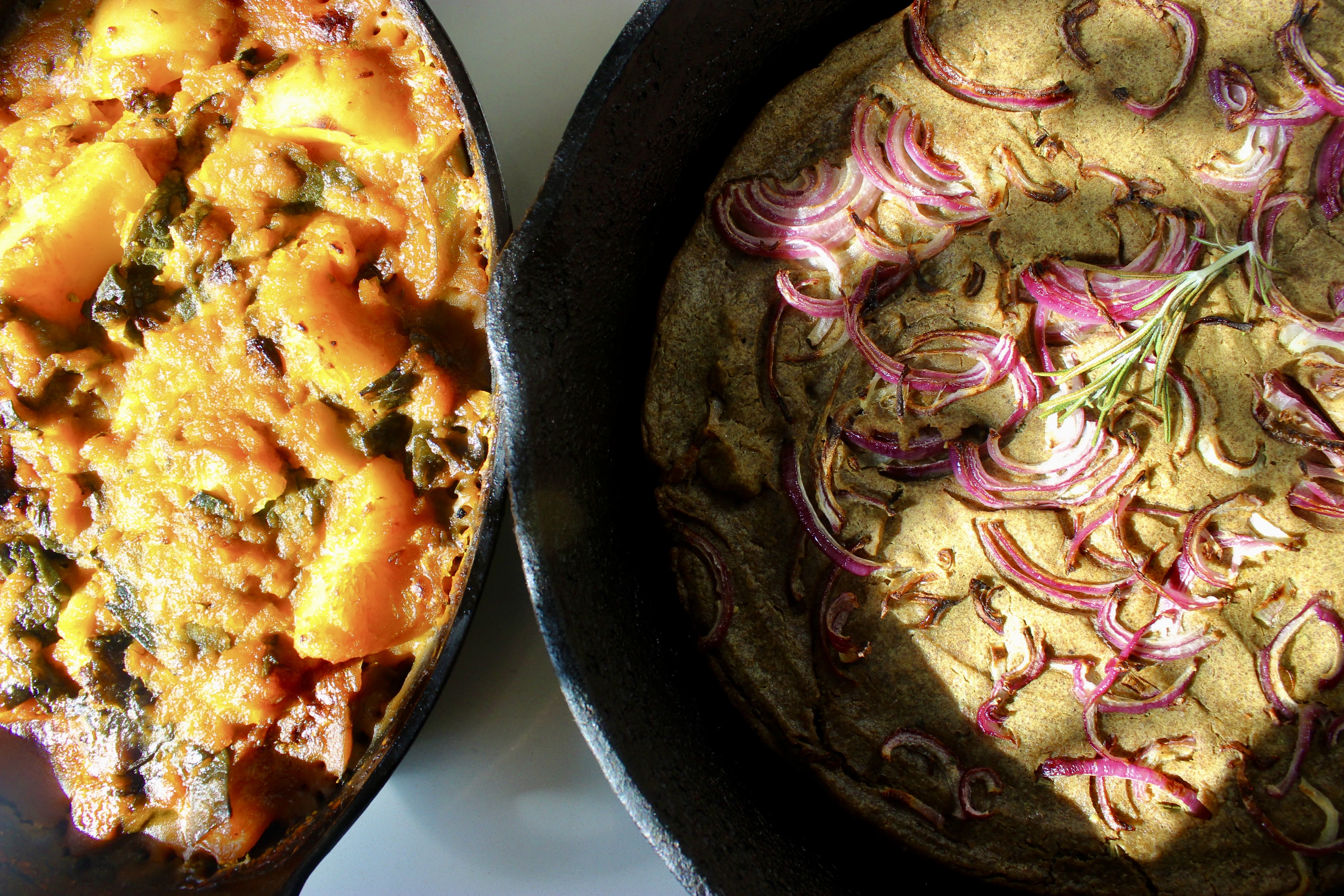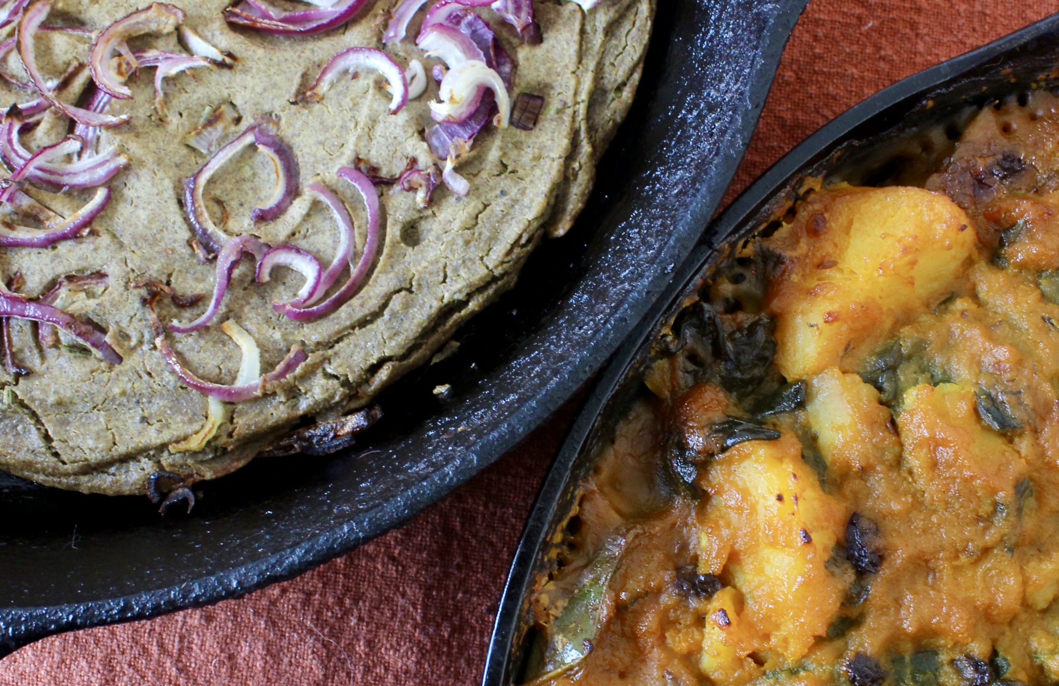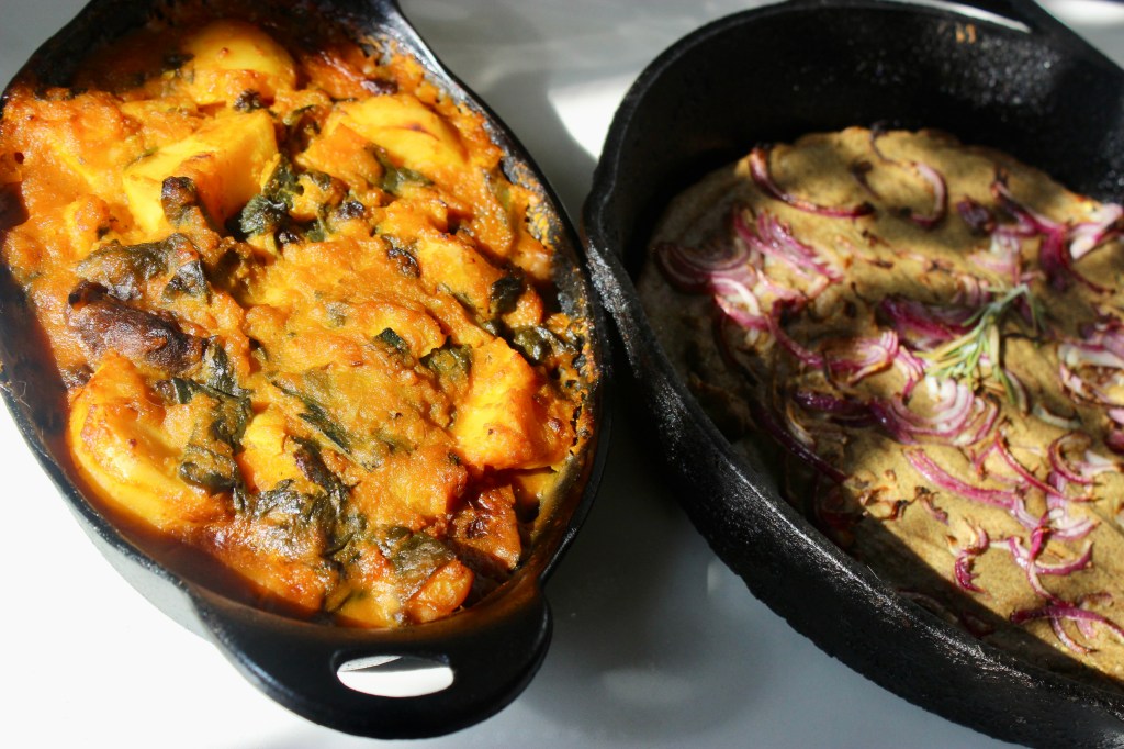 The exact vegetables used in the stew are wildly flexible to what is in season, available and to your tastes. This menu is truly all over the global map. The stew is Iranian, the baked chickpea pancake is dish from the French/ Italian border, but I make it with Kala Besan (black chickpea flour) from India and add rosemary, which is not used in Persian cookery to my knowledge. All of this is to say, if you cannot find the specialty ingredients do not fret. I’ve provided substition suggestions that will be delicious. The goal of this menul is not to make something authentic to any one culture, but rather to make hearty and healthy food and, if possible, venture into trying some interesting ingredients from amazing cuisines from other parts of the world.