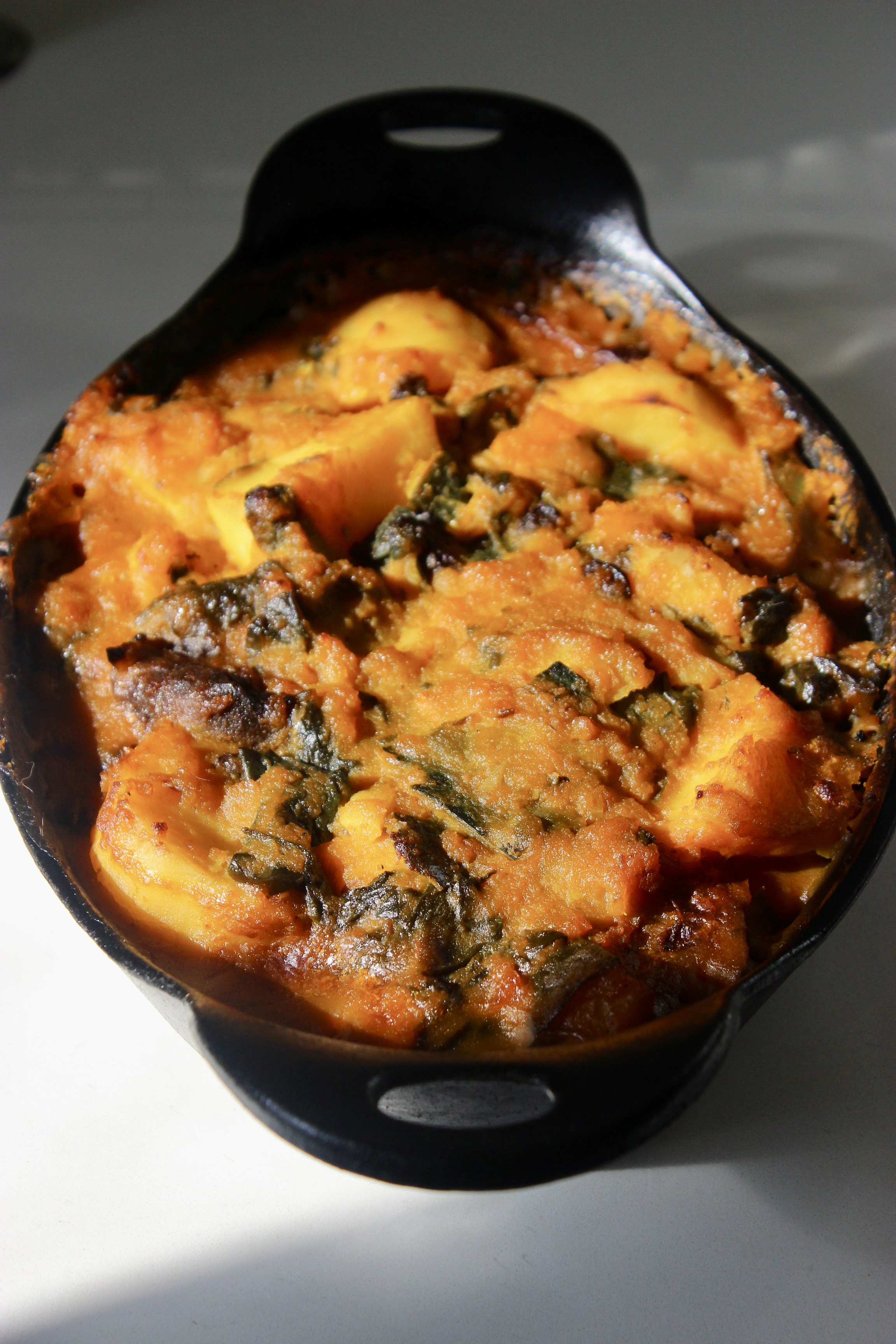 - Transfer everything to a HUGE baking tray, or (if you are me) freeze half of it at this point because my largest baking tray only holds half of this recipe. I actually freeze it in much smaller portions, to take out and bake in the little cast iron baking tray pictured here.